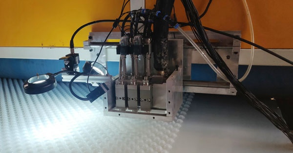 自粘式防排水板自動涂膠設(shè)備。 通過視覺識別引導(dǎo)噴膠機動作,實現(xiàn)快速、精確噴膠,在滿足產(chǎn)品使用要求基礎(chǔ)上,減少了自粘膠用膠量,降低了工人勞動強度,提高了產(chǎn)品質(zhì)量,為企業(yè)創(chuàng)造更多的利潤。